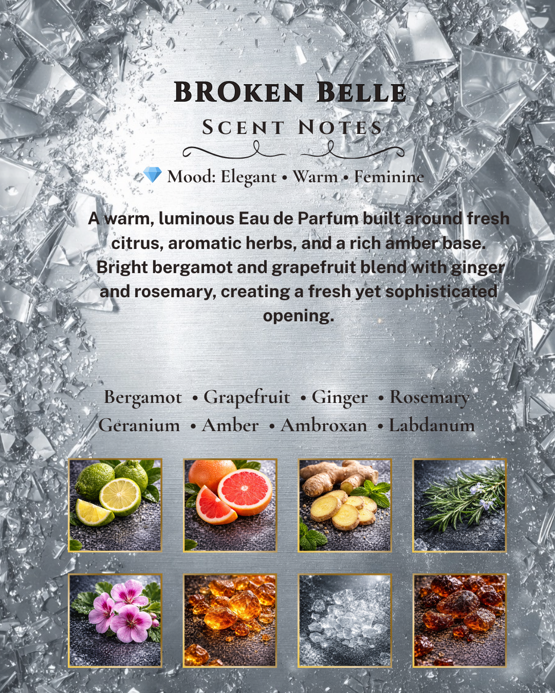 Soft yet confident, this fragrance wraps you in warmth from the very first spray. Fresh citrus and aromatic herbs open the scent with brightness, slowly melting into a sensual amber core that lingers beautifully on the skin. Feminine, elegant, and quietly addictive. Inspired by the joy of self-confidence and effortless beauty, Broken Belle is made for women who glow without trying.